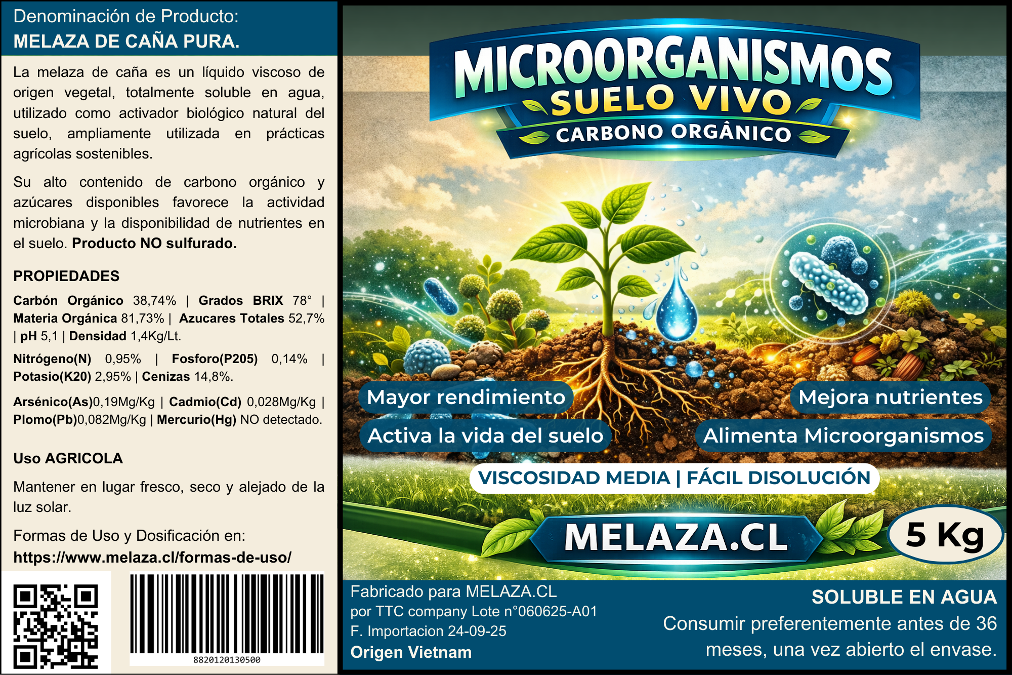 Melaza de caña pura de alta calidad, ideal para la multiplicación y activación de microorganismos beneficiosos del suelo en sistemas agrícolas y regenerativos.